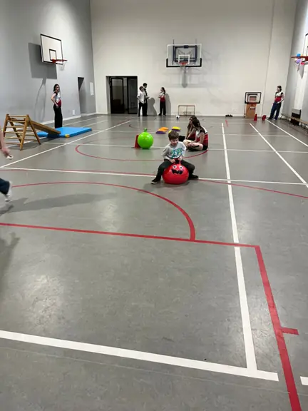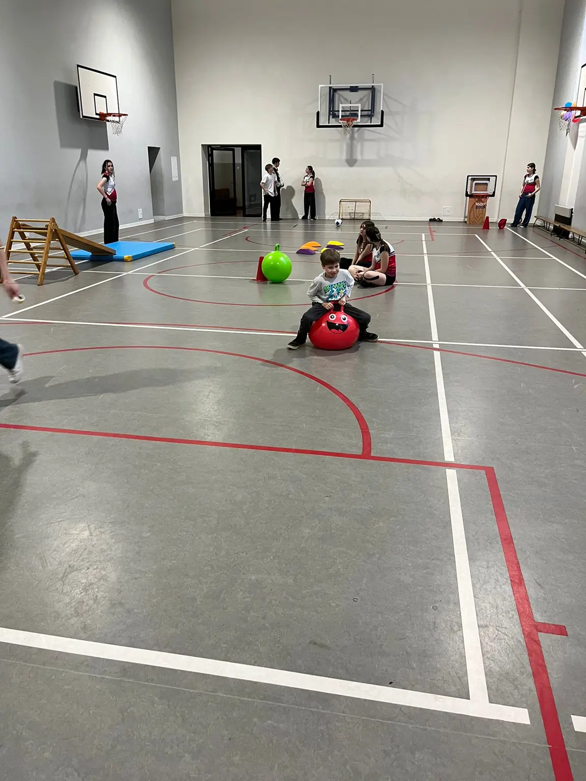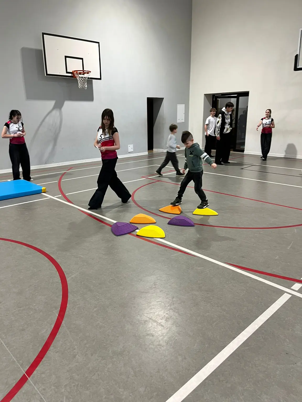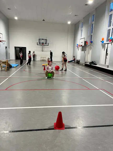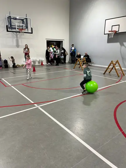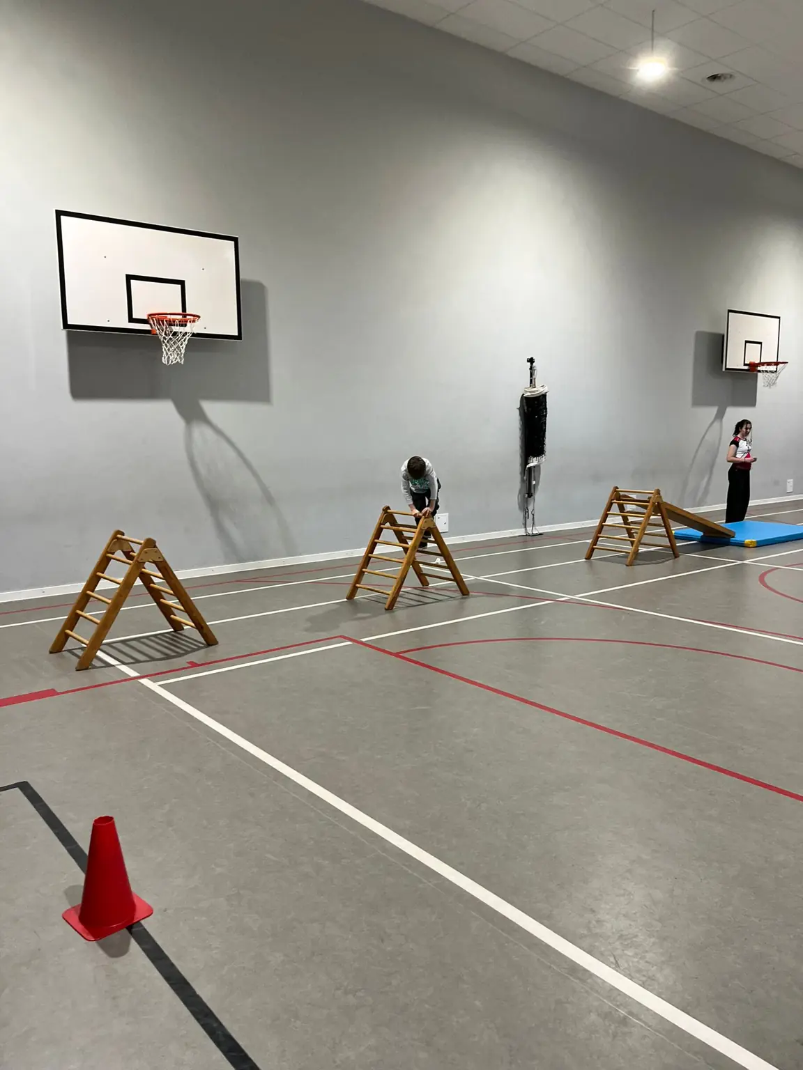 Sportowe wyzwania: dynamiczny tor przeszkód przygotowany na sali gimnastycznej.