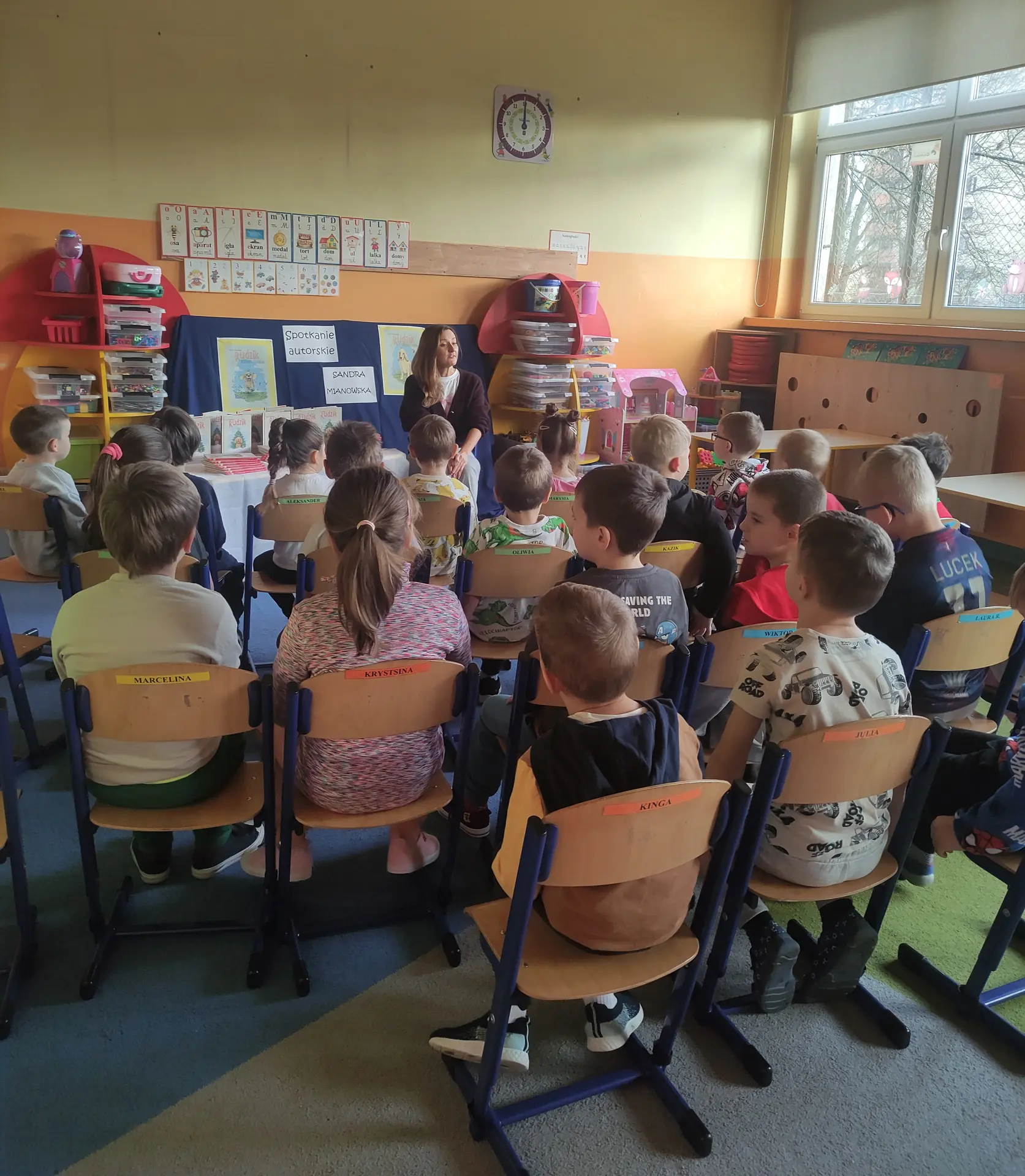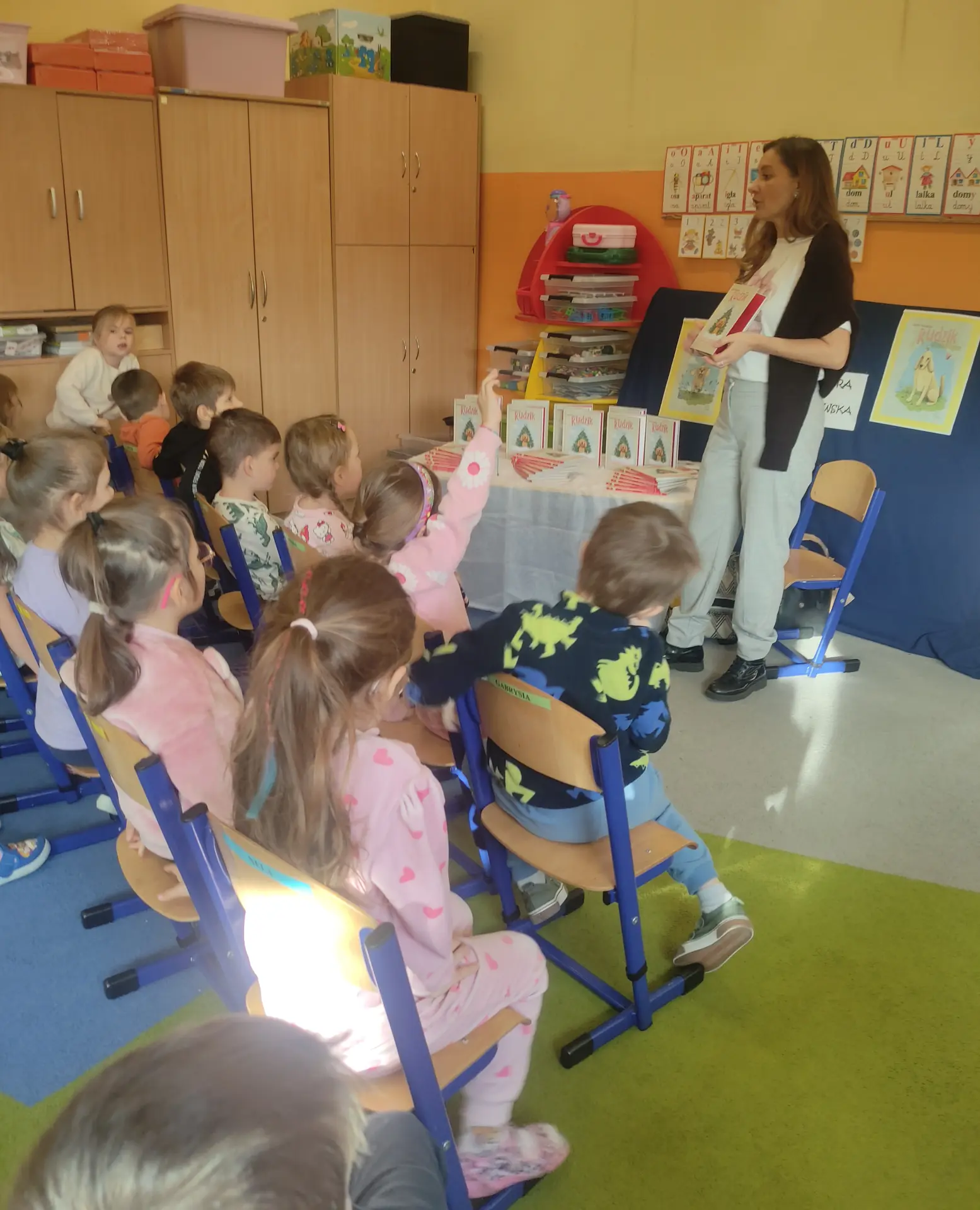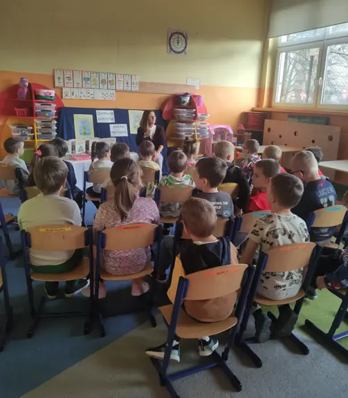 W oddziałach przedszkolnych dzieci starszych odbyło się wyjątkowe spotkanie z Panią Sandrą Mianowską, szczecińską autorką pełnej humoru i ciepła książki "Rudzik. Pierwsza gwiazdka". Dzieci miały okazję poznać historię uroczego pieska, który opowiada o swoich codziennych przygodach, rodzinie i trudnościach z przestrzeganiem domowych zasad. Mali słuchacze szybko pokochali bohatera, a pełne uśmiechu opowieści autorki wzbudziły ogromne zainteresowanie literaturą. Wydarzenie zostało zorganizowane w ramach Narodowego Programu Rozwoju Czytelnictwa promując wśród najmłodszych radość płynącą z obcowania z książką.