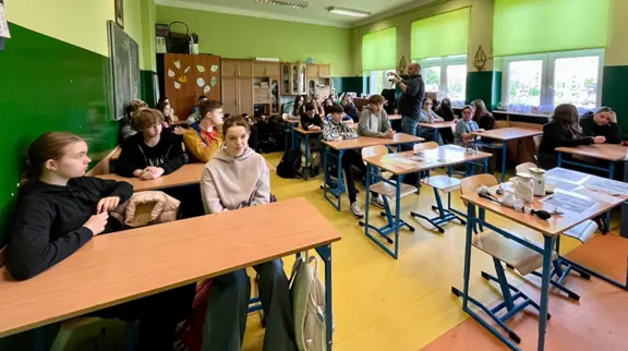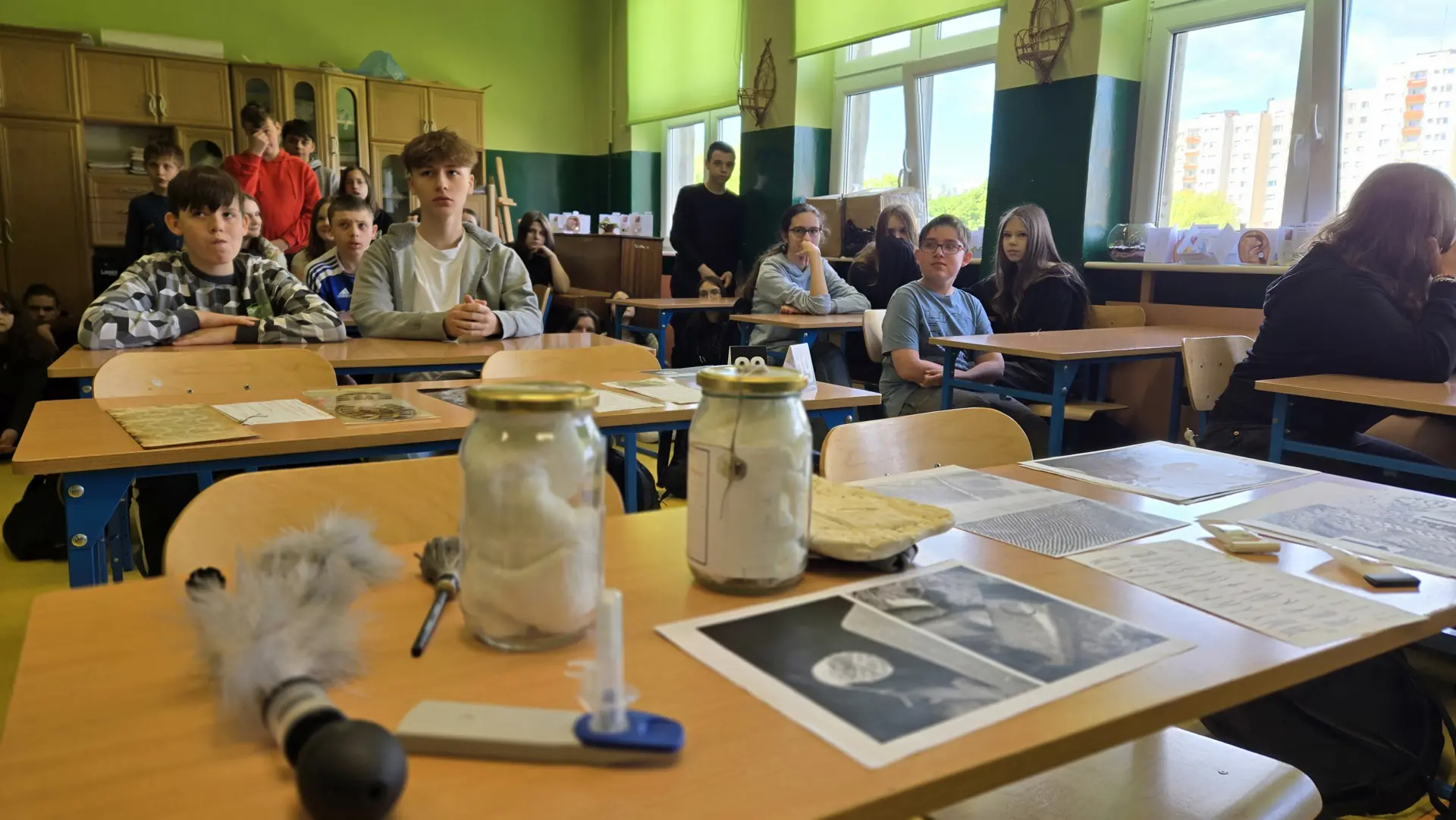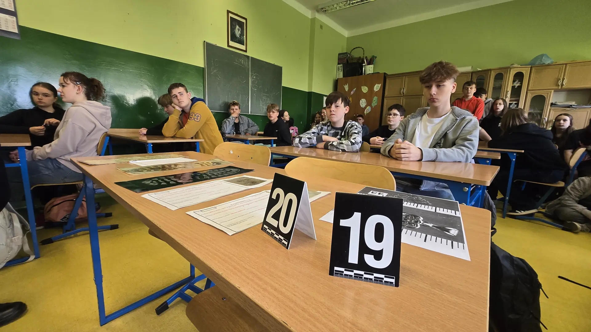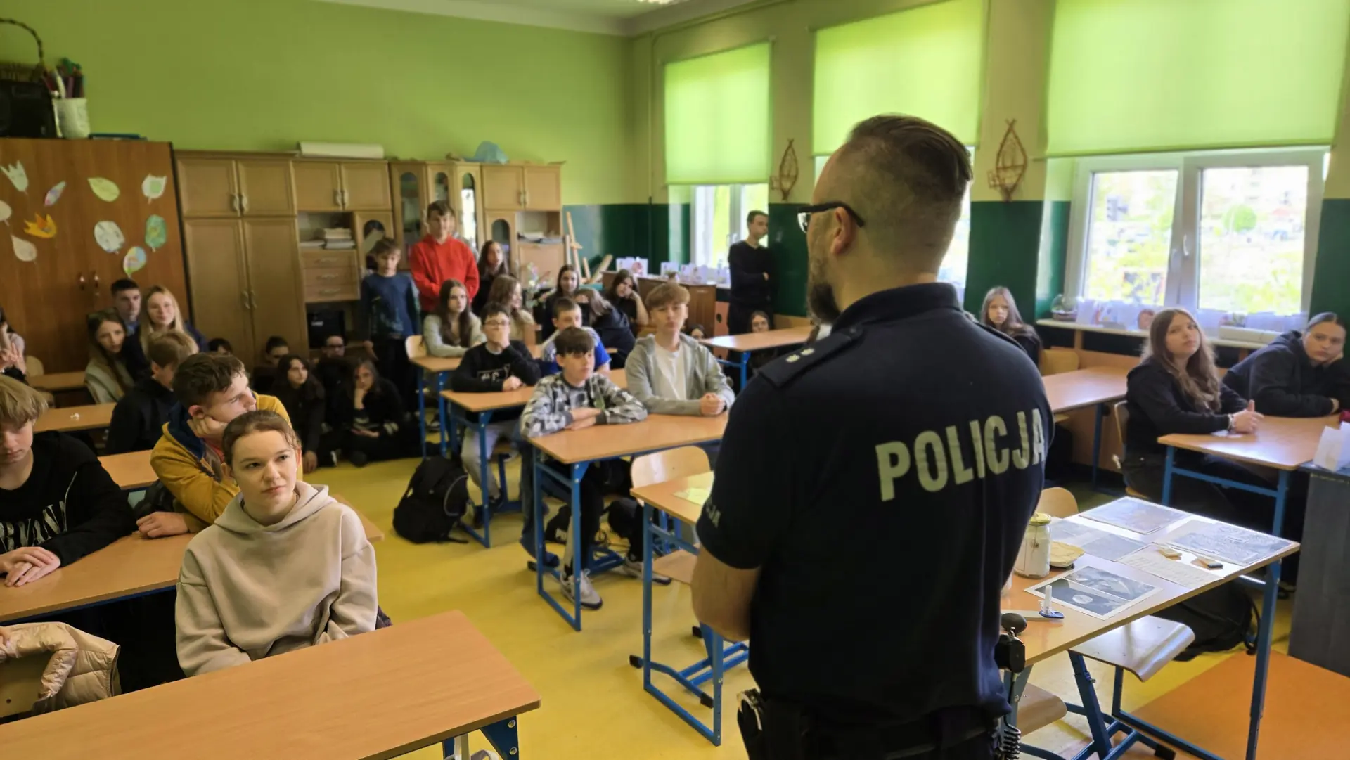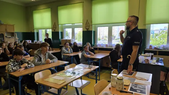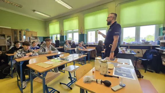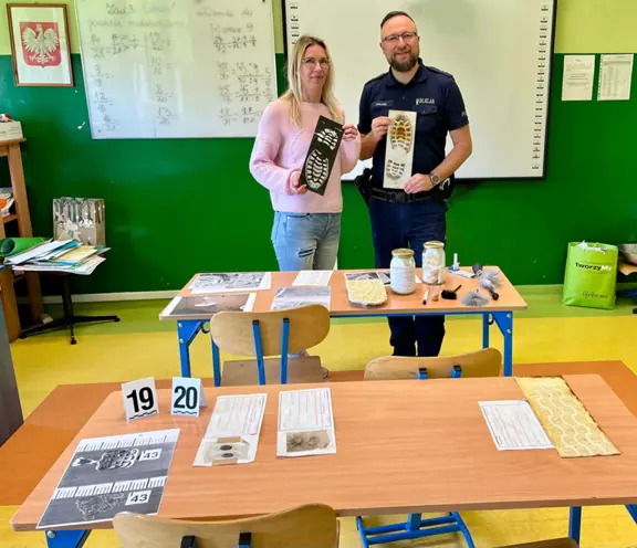 16.05 klasy siódme odwiedzili technicy kryminalni z Komendy Miejskiej Policji. Pokazali, jak wygląda ich praca, która polega na zbieraniu, zabezpieczaniu i analizie dowodów na miejscu przestępstwa. Tłumaczyli uczniom, jakie mamy dowody - próbki biologiczne, odciski palców, narzędzia, przedmioty. Technicy kryminalni opowiadali, jak zabezpiecza się miejsce przestępstwa oraz pokazywali urządzenie służące do wykrywania substancji niedozwolonych.