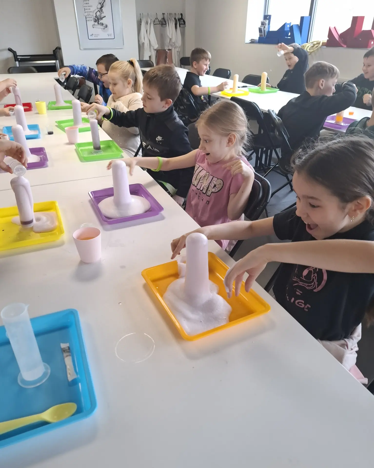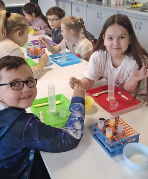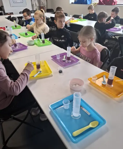 Dzieci wykonywały bardzo ciekawe doświadczenia. Wszyscy fajnie się bawili. Myślę, że długo i z uśmiechem będą wspominać to interesujące spotkanie.