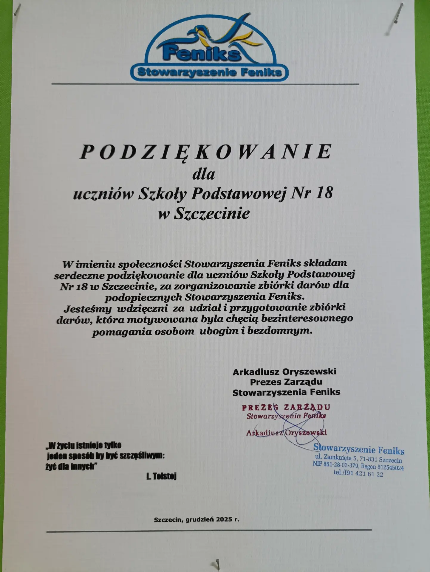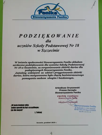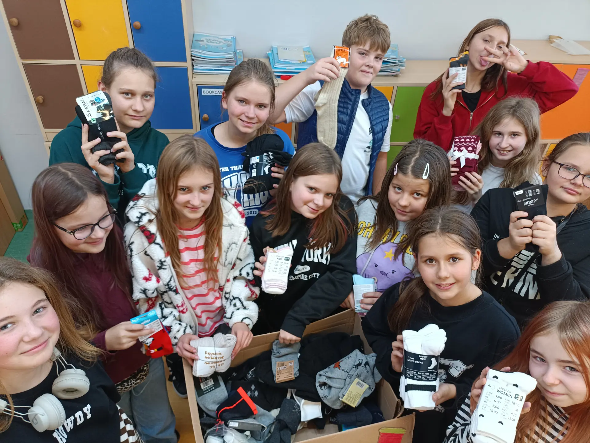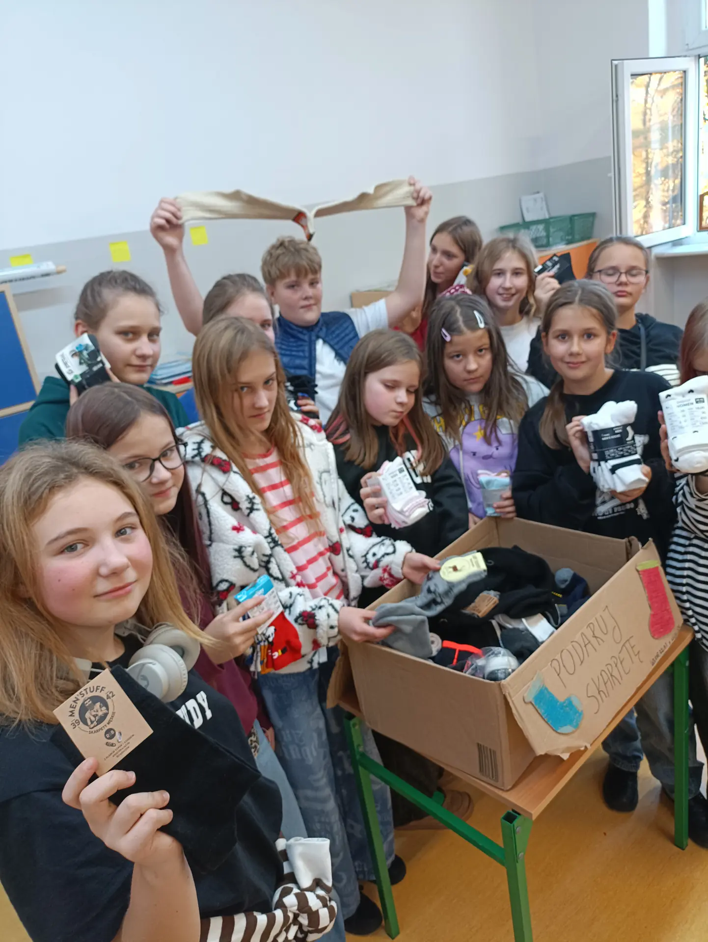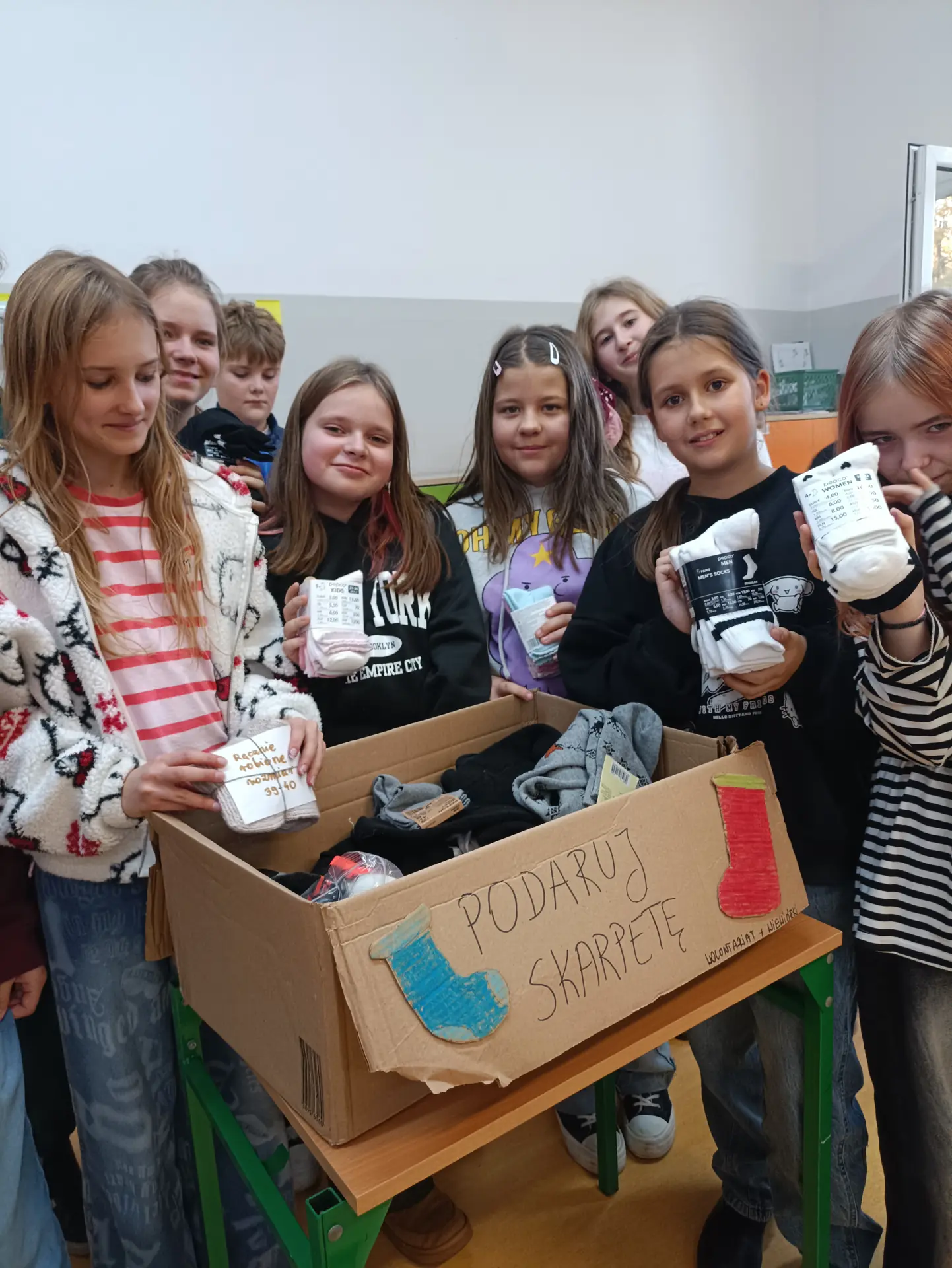 Wolontariusze z klas piątych i szóstych serdecznie dziękują wszystkim darczyńcom za udział w zimowej zbiórce skarpet dla osób w kryzysie bezdomności. Zebrane dary zostały przekazane do noclegowni przy ul. Zamkniętej 5 w Szczecinie dla podopiecznych Stowarzyszenia Feniks. Dzięki Waszej pomocy udało się zebrać 96 par skarpet i wesprzeć potrzebujących w trudnym zimowym czasie. Dziękujemy!