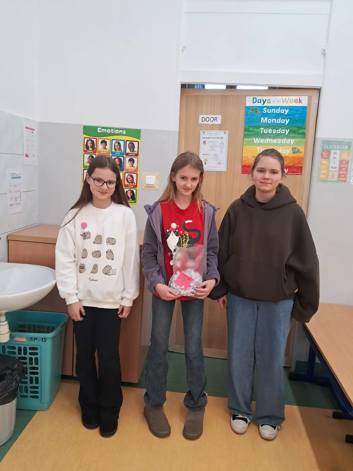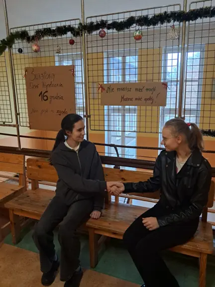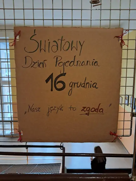 16 grudnia obchodziliśmy w naszej szkole Światowy Dzień Pojednania. Z tej okazji wolontariuszki Kaja Wróblewska-Kręgiel i Lila Słodkowska z kl. 5B oraz Ola Bagińska, Julia Rudnicka i Alicja Borys z kl. 6C obdarowały każdego ucznia dobrym słowem dotyczącym zgody, pojednania, przebaczenia, pokoju. W tym dniu każdy uczeń został zachęcony do przemyślenia i zastanowienia się nad relacjami międzyludzkimi w klasie, w szkole, w domu.