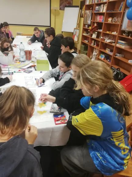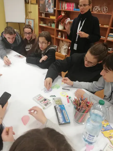 Po posadzeniu cebulek żonkili troje z naszych wolontariuszy zwiedziło budynek hospicjum i spotkało się z chorymi. Pozostali napisali na kolorowych kartkach dobre myśli dla chorych, przygotowując kolejną akcję - Dzień Życzliwości i Pozdrowień.