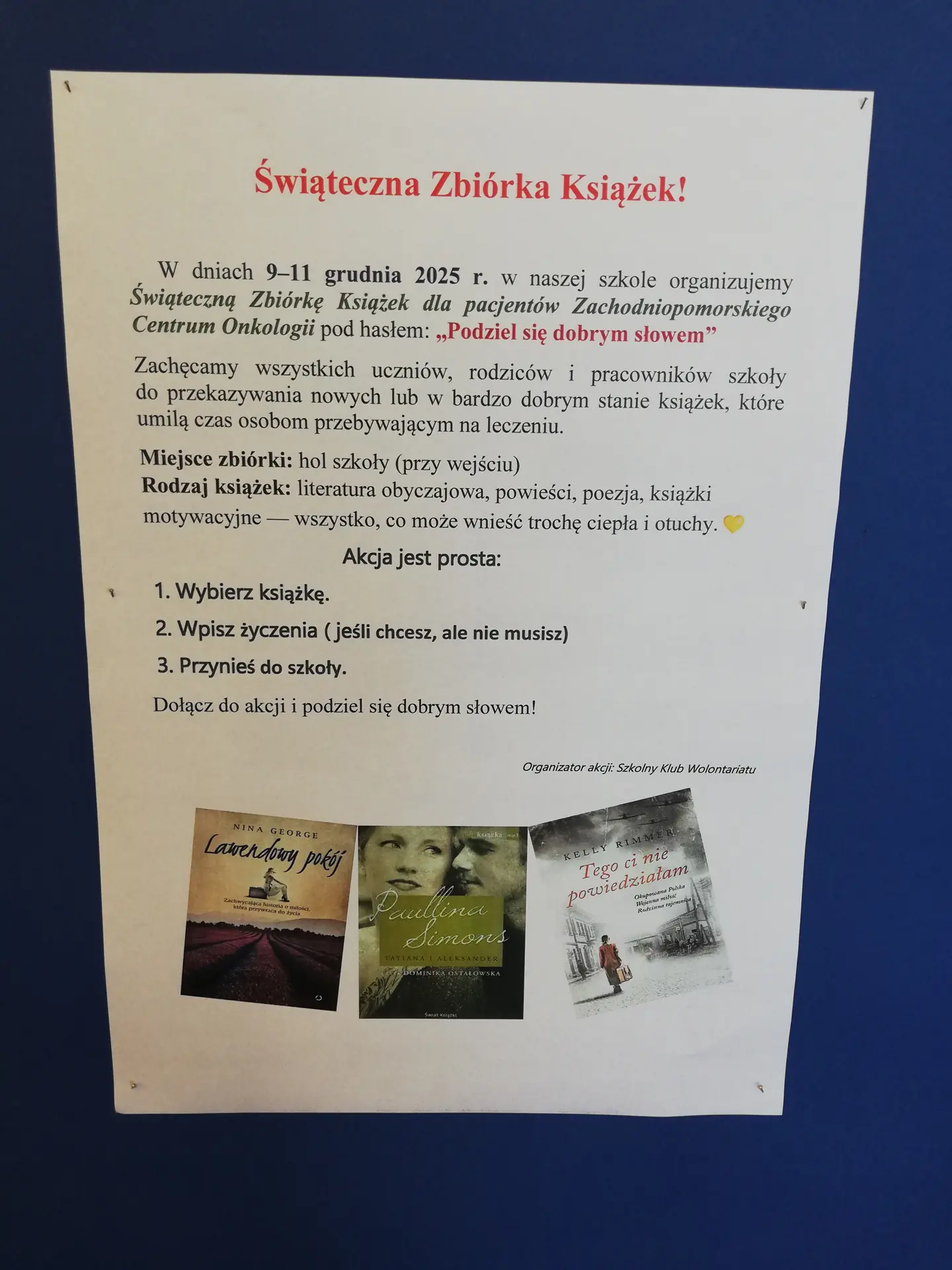 W dniach 9–11 grudnia 2025 r. w naszej szkole zorganizowaliśmy świąteczną zbiórkę książek dla pacjentów Zachodniopomorskiego Centrum Onkologii pod hasłem: „Podziel się dobrym słowem”. Przez trzy dni zebraliśmy karton ciekawych książek, które pani wicedyrektor Dorota Chrobrowska z panią Anią Czarnobaj zawiozły do ZCO. Mamy nadzieję, że uda nam się wnieść w serca pacjentów zmagających się z chorobami nowotworowymi, trochę ciepła i otuchy, a czytanie podarowanych książek umili czas osobom przebywającym na leczeniu.